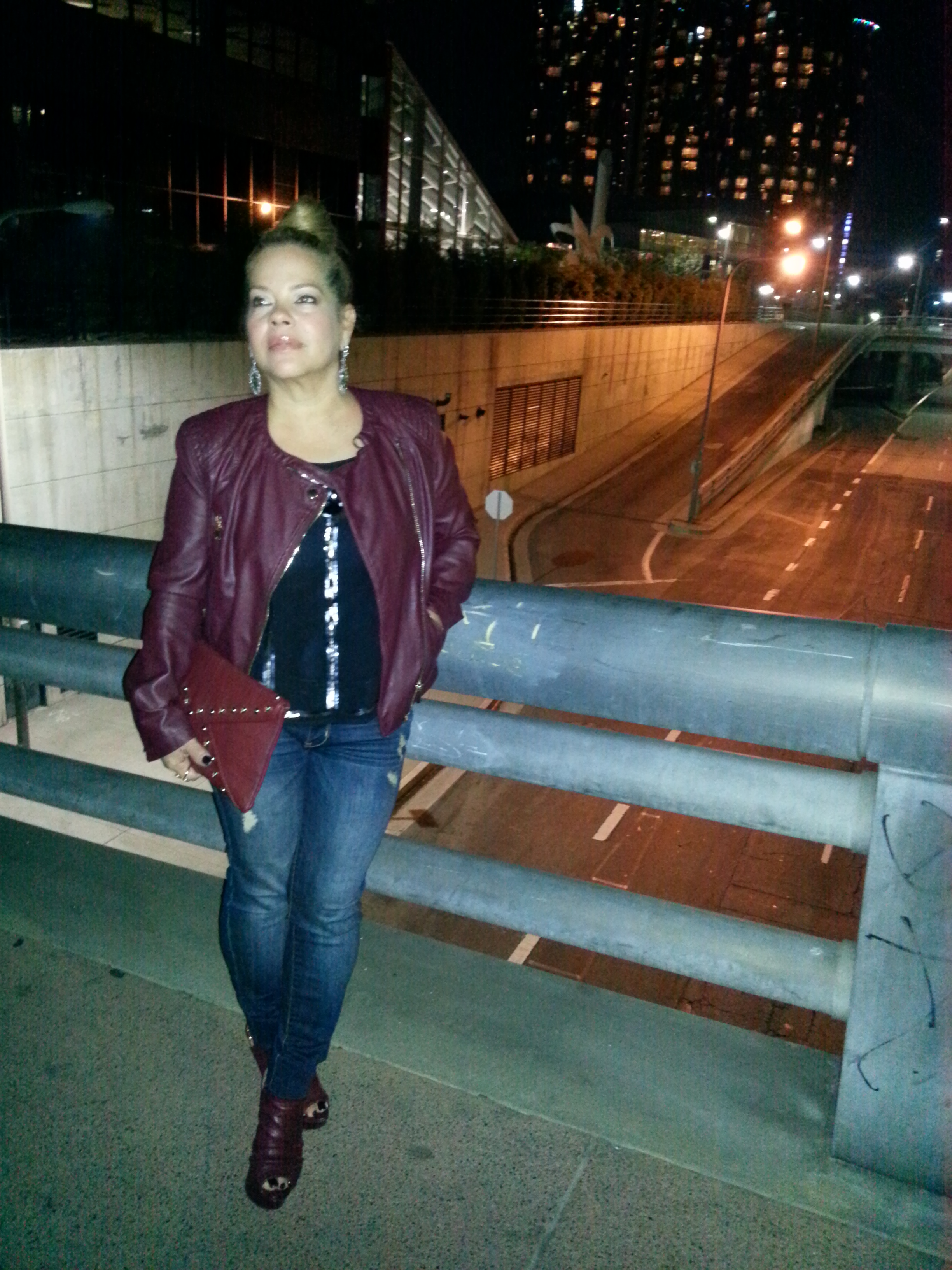 Now…what to wear? Well, after much thought and a pile of clothes on my bed, I decided that I would try something different…an edgy look for the night out on the town… I wore my fav Bordeaux short jacket, my skinny jeans, a sequined black transparent top and Wine colored heels and clutch. The final touch were my chandelier earrings and a smokey eye. By the way, we had a blast!